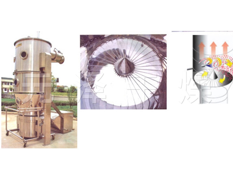 LBF 旋流流化床制粒包衣機(jī)是將流化床做成葉片式結(jié)構(gòu)的流化床,并使葉片呈一定斜度,讓氣流從葉片的間隙通過,形成環(huán)流狀的強(qiáng)大氣流,使物料呈旋渦狀似的有序運動,同時安裝在側(cè)壁的氣動噴嘴將粘合劑或包衣液噴入呈旋渦狀的物料層,從而將粉體制成顆?;颢@得連續(xù)均勻的衣膜。