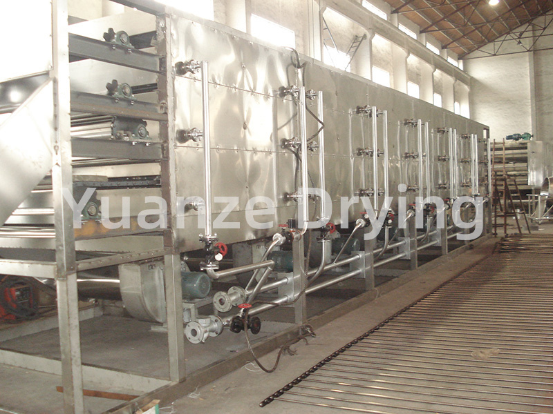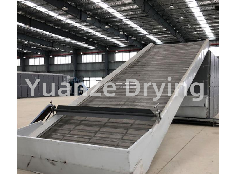 During the operation of the dryer, cold air is heated through a heat exchanger, and a scientific and reasonable circulation method is adopted to allow the hot air to flow through the dried material on the bed surface for uniform heat and mass exchange. The hot air flow in each unit of the machine is circulated by the circulation fan, and then low temperature and high humidity air is discharged to smoothly and efficiently complete the entire drying process.