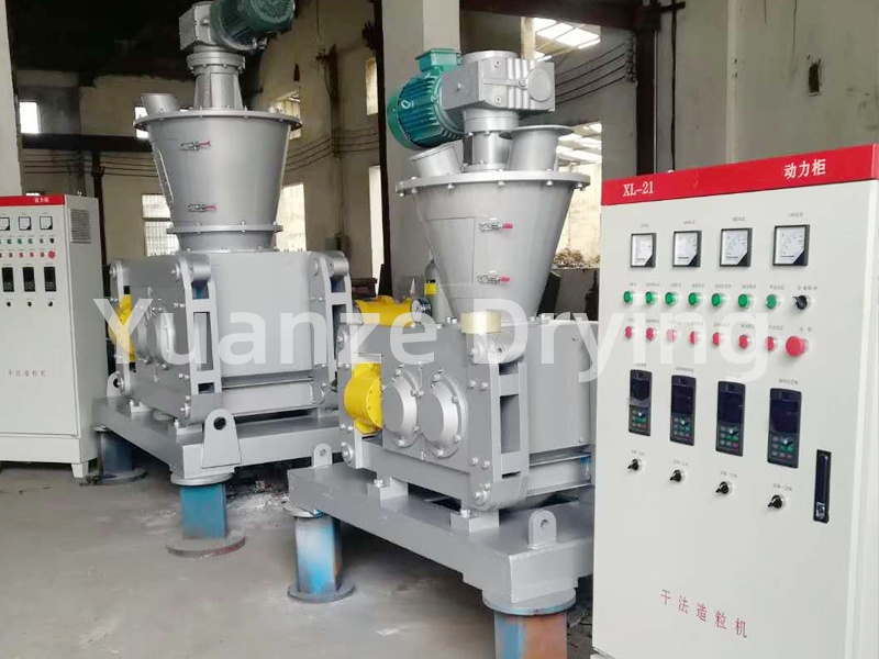 The powdered material is quantitatively fed by a vibrating feeder through a transverse spiral feeder, and uniformly fed into the main material hopper of the rolling mill to maintain a constant amount of material particles. Then, the powder is pre compressed by the longitudinal conical spiral inside the main material hopper of the rolling mill and transported to the arc-shaped grooves of the two pressure rollers. The surfaces of the two pressure rollers are evenly distributed with semi flat circular or diamond grooves of the same shape. Through the meshing transmission of a pair of gears, the two pressure rollers rotate at the same speed and in reverse, The material conveyed by the conical spiral to the groove is bitten into the groove and instantly forced to compress. After compression, the material gradually decreases with the pressure and falls off from the groove under its elasticity and gravity, entering the crushing and granulation system. Then, according to the user's particle size requirements, it is sieved and graded to obtain uniform granular products that meet quality requirements. The screened powder is then returned to the vibrating hopper for recycling.