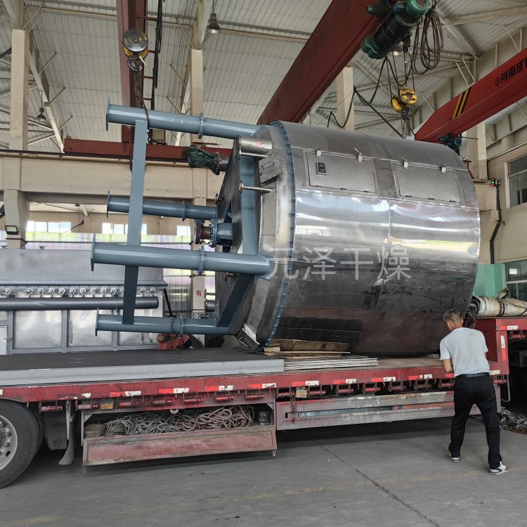 濕物料自加料器連續(xù)地加到干燥器上部第一層干燥盤上,帶有耙葉的耙臂作回轉(zhuǎn)運(yùn)動(dòng)使耙臂作回轉(zhuǎn)運(yùn)動(dòng)使耙葉連續(xù)地翻抄物料。物料沿指數(shù)螺旋線流過干燥盤表面,在小干燥盤上的物料被移送到外緣,并在外緣落到下方的大干燥盤外緣,在大干盤上物料向里移動(dòng)并從中間落料口落如下一層小干燥盤中。大小干燥盤上下交替排列,物料得以連續(xù)地流過整個(gè)干燥器。中空的干燥盤內(nèi)通入加熱介質(zhì),加熱介質(zhì)形式有飽和蒸汽、熱水、導(dǎo)熱油和高溫熔鹽,加熱介質(zhì)由干燥盤的一端進(jìn)入,從另一端導(dǎo)出。已干物料從最后一層干燥盤落到殼體的底層,最后被耙葉移送到出料口排出。濕份從物料中溢出,由設(shè)在頂蓋上的排濕口排出,真空型盤式干燥器的濕氣由設(shè)在頂蓋上的真空泵口排出。從底層排出的干物料可直接包裝。通過配加翅片加熱器、溶劑回收冷凝器、袋式除塵器、干料返混機(jī)構(gòu)、引風(fēng)機(jī)等輔機(jī),可提高其干燥的生產(chǎn)能力,干燥膏糊狀和熱敏性物料,可方便地回收溶劑,并能進(jìn)行熱解和反應(yīng)操作。