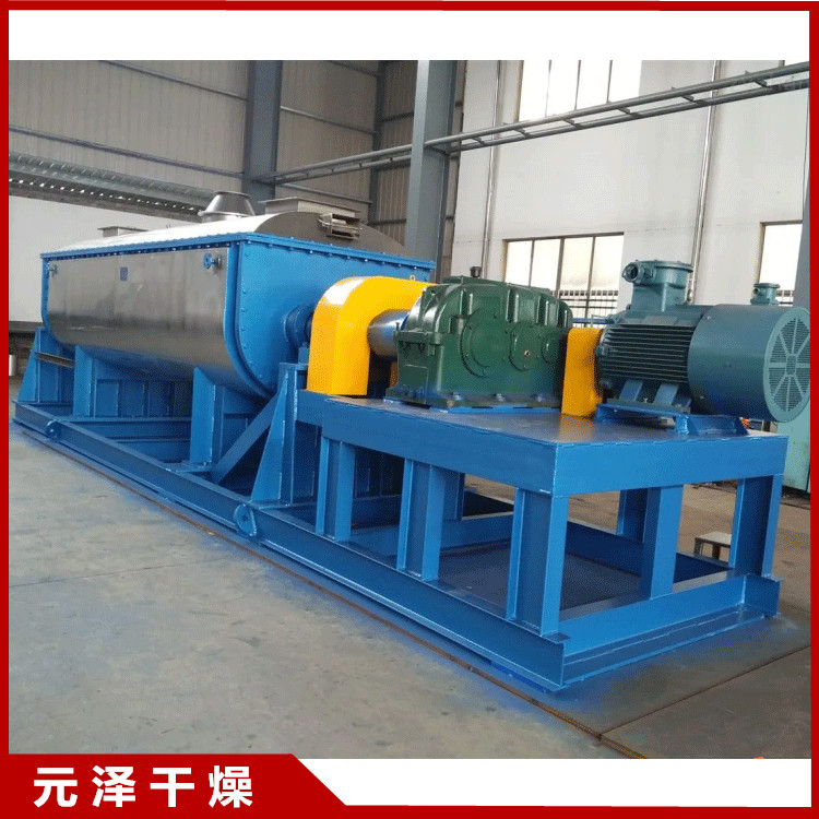 空心軸上密集排列著楔型中空漿葉,熱介質(zhì)經(jīng)空心軸流經(jīng)漿葉。單位有效容積內(nèi)傳熱面積很大,熱介質(zhì)溫度從-40℃到320℃,可以是水蒸汽,也可以是液體型:如熱水、導(dǎo)熱油等。間接傳導(dǎo)加熱,沒(méi)有攜帶空氣帶走熱量,熱量均用來(lái)加熱物料。熱量損失僅為通過(guò)器體保溫層向環(huán)境的散熱。楔型漿葉傳熱面具有自清潔功能。物料顆粒與楔型面的相對(duì)運(yùn)動(dòng)產(chǎn)生洗刷作用,能夠洗刷掉楔型面上附著物料,使運(yùn)轉(zhuǎn)中一直保持著清潔的傳熱面。漿葉干燥機(jī)的殼體為Ω型,殼體內(nèi)一般安排二到四根空心攪拌軸。殼體有密封端蓋與上蓋,防止物料粉塵外泄而充分發(fā)揮作用。