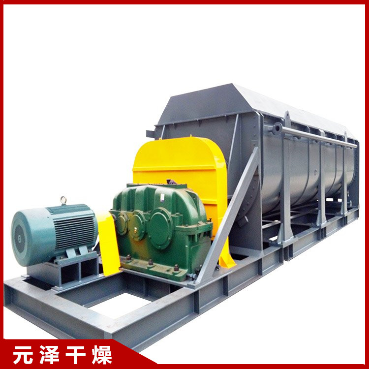 空心軸上密集排列著楔型中空漿葉,熱介質(zhì)經(jīng)空心軸流經(jīng)漿葉。單位有效容積內(nèi)傳熱面積很大,熱介質(zhì)溫度從-40℃到320℃,可以是水蒸汽,也可以是液體型:如熱水、導(dǎo)熱油等。間接傳導(dǎo)加熱,沒有攜帶空氣帶走熱量,熱量均用來加熱物料。熱量損失僅為通過器體保溫層向環(huán)境的散熱。楔型漿葉傳熱面具有自清潔功能。物料顆粒與楔型面的相對運(yùn)動(dòng)產(chǎn)生洗刷作用,能夠洗刷掉楔型面上附著物料,使運(yùn)轉(zhuǎn)中一直保持著清潔的傳熱面。漿葉干燥機(jī)的殼體為Ω型,殼體內(nèi)一般安排二到四根空心攪拌軸。殼體有密封端蓋與上蓋,防止物料粉塵外泄而充分發(fā)揮作用。