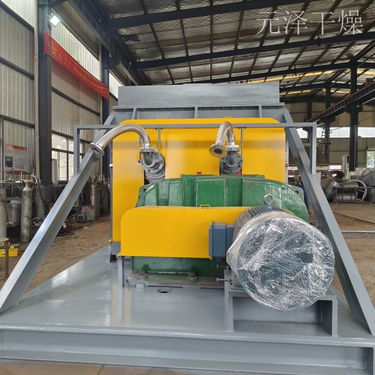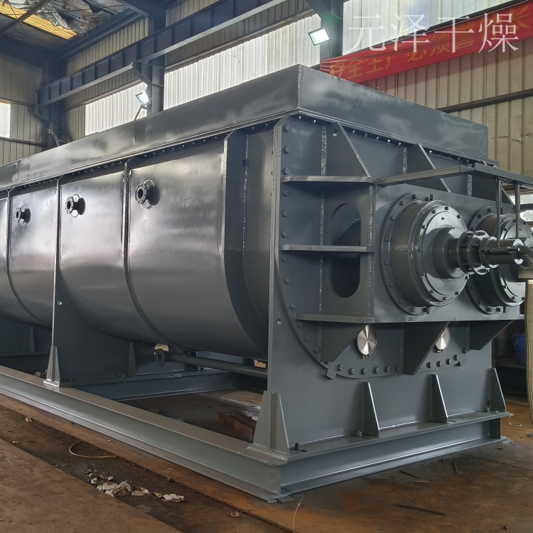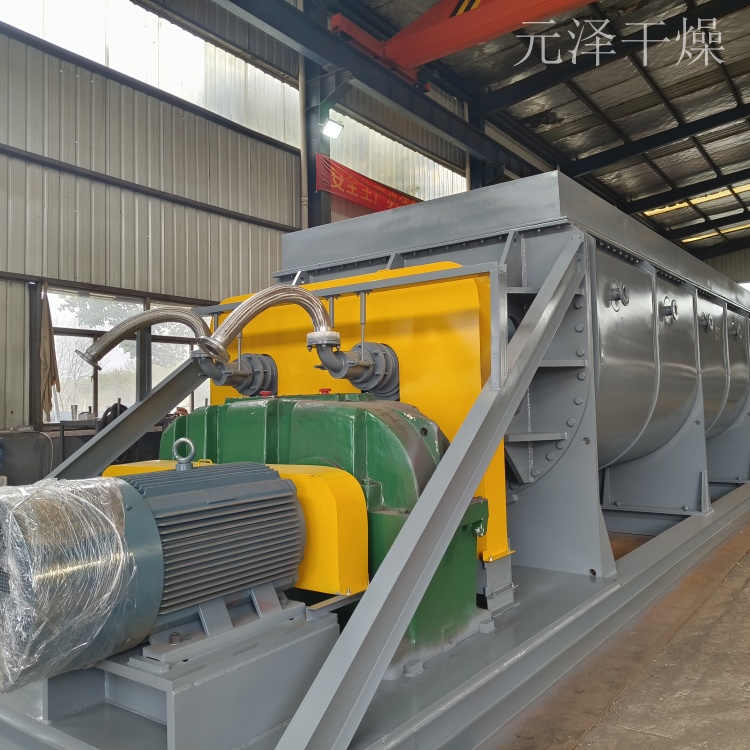 空心軸上密集排列著楔型中空漿葉,熱介質(zhì)經(jīng)空心軸流經(jīng)漿葉。單位有效容積內(nèi)傳熱面積很大,熱介質(zhì)溫度從-40℃到320℃,可以是水蒸汽,也可以是液體型:如熱水、導(dǎo)熱油等。間接傳導(dǎo)加熱,沒有攜帶空氣帶走熱量,熱量均用來加熱物料。熱量損失僅為通過器體保溫層向環(huán)境的散熱。楔型漿葉傳熱面具有自清潔功能。物料顆粒與楔型面的相對運(yùn)動(dòng)產(chǎn)生洗刷作用,能夠洗刷掉楔型面上附著物料,使運(yùn)轉(zhuǎn)中一直保持著清潔的傳熱面。槳葉干燥機(jī)的殼體為Ω型,殼體內(nèi)一般安排二到四根空心攪拌軸。殼體有密封端蓋與上蓋,防止物料粉塵外泄而充分發(fā)揮作用。