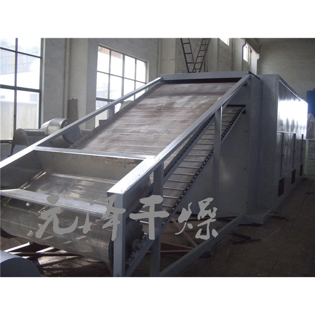 物料由加料器均勻地鋪在網(wǎng)帶上,網(wǎng)帶一般采用12-60目不銹鋼絲網(wǎng),由傳動裝置拖動在干燥機內(nèi)移動。干燥機由若干單元組成,每一單元熱風(fēng)獨立循環(huán),部分尾氣由專門排濕風(fēng)機排出,廢氣由調(diào)節(jié)閥控制,熱氣由下往上或由上往下穿過鋪滿物料的網(wǎng)帶完成熱量與質(zhì)量傳遞的進程,帶走物料水份。網(wǎng)帶緩慢移動,運行速度可根據(jù)物料溫度自由調(diào)節(jié),干燥后的成品連續(xù)落入收料器中。上下循環(huán)單元根據(jù)用戶需要可靈活配備,單元數(shù)量亦可根據(jù)需要選取。