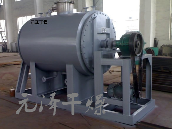 主要結(jié)構(gòu)為帶夾套的臥式圓筒容器,裝有低速攪拌軸,軸上裝有按一定方向排列的耙齒。攪拌軸有兩種形式,一種為不加熱的耙齒軸,另一種為可通入熱介質(zhì)的中空耙齒軸。夾套內(nèi)通入加熱介質(zhì)(熱水、熱油)。筒體內(nèi)加入定量的濕物料,耙齒軸對物料進(jìn)行攪拌,使物料加熱均勻,耙齒軸在時(shí)間繼電器的控制下,按一定時(shí)間間隔要求按正轉(zhuǎn)-停止-反轉(zhuǎn)-停止-正轉(zhuǎn)運(yùn)行,運(yùn)行周期由用戶根據(jù)物料的工藝操作條件來設(shè)定。筒體中被干燥的物料在耙齒軸有規(guī)律的攪拌下,周而復(fù)始,直至物料被干燥到工藝要求。內(nèi)筒體上部安置有真空接口,接入真空系統(tǒng),使被干燥物料在負(fù)壓下加熱干燥,可保證干燥物料在低溫下加熱,不致破壞物料的物化性質(zhì)。物料達(dá)到干燥要求后,打開筒體下部的放料閥,讓物料在耙齒軸的攪拌下向中間移動(dòng)進(jìn)行出料。