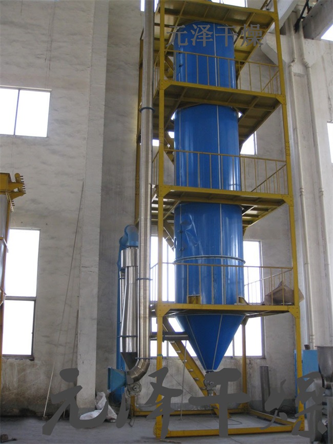 壓力式噴霧干燥機(jī)工作過(guò)程為:料液通過(guò)隔膜泵高壓輸入,噴出霧狀液滴,然后同熱空氣并流下降,大部分粉粒由塔底排料口收集,廢氣及其微小粉末經(jīng)旋風(fēng)分離器分離,廢氣由抽風(fēng)機(jī)排出,粉末由設(shè)在旋風(fēng)分離器下的收粉筒收集,風(fēng)機(jī)出口處還可裝備二級(jí)除塵裝置,回收率在96%-98%。