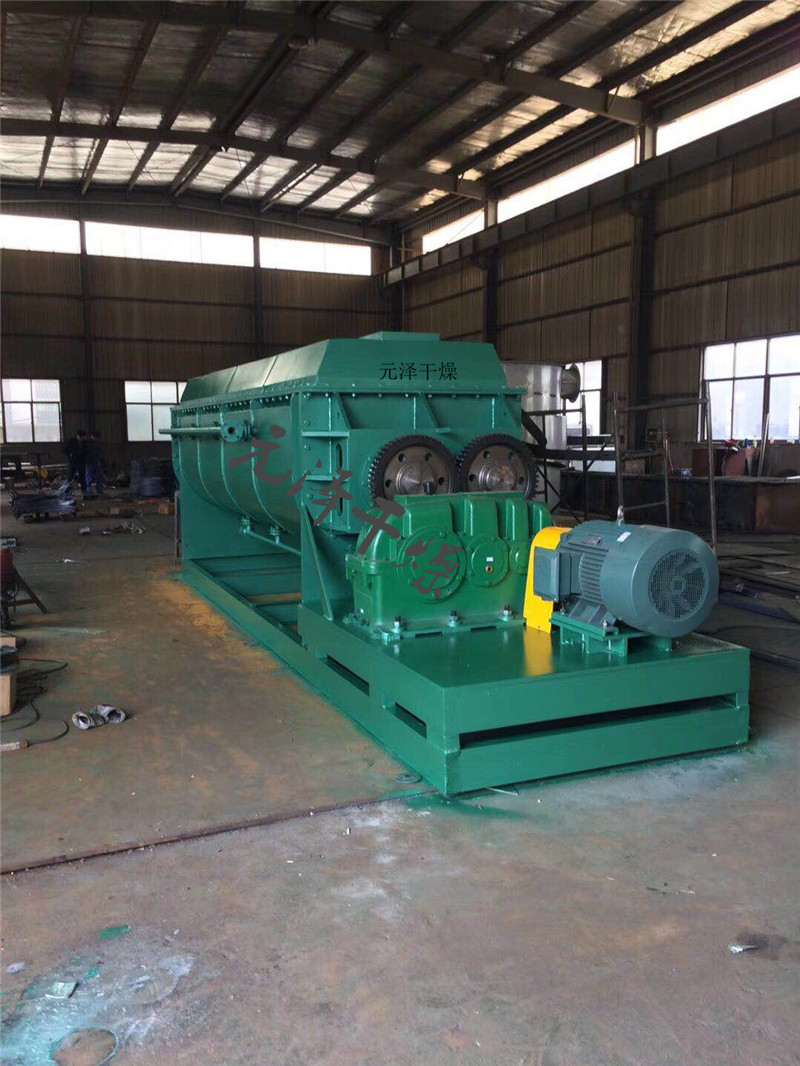 空心軸上密集排列著楔型中空漿葉,熱介質(zhì)經(jīng)空心軸流經(jīng)漿葉。單位有效容積內(nèi)傳熱面積很大,熱介質(zhì)溫度從-40℃到320℃,可以是水蒸汽,也可以是液體型:如熱水、導(dǎo)熱油等。間接傳導(dǎo)加熱,沒有攜帶空氣帶走熱量,熱量均用來加熱物料。熱量損失僅為通過器體保溫層向環(huán)境的散熱。楔型漿葉傳熱面具有自清潔功能。物料顆粒與楔型面的相對運動產(chǎn)生洗刷作用,能夠洗刷掉楔型面上附著物料,使運轉(zhuǎn)中一直保持著清潔的傳熱面。漿葉干燥機的殼體為Ω型,殼體內(nèi)一般安排二到四根空心攪拌軸。殼體有密封端蓋與上蓋,防止物料粉塵外泄而充分發(fā)揮作用。