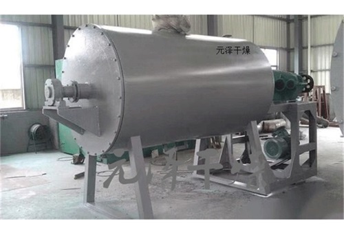 主要結(jié)構(gòu)為帶夾套的臥式圓筒容器,裝有低速攪拌軸,軸上裝有按一定方向排列的耙齒。攪拌軸有兩種形式,一種為不加熱的耙齒軸,另一種為可通入熱介質(zhì)的中空耙齒軸。夾套內(nèi)通入加熱介質(zhì)(熱水、熱油)。筒體內(nèi)加入定量的濕物料,耙齒軸對(duì)物料進(jìn)行攪拌,使物料加熱均勻,耙齒軸在時(shí)間繼電器的控制下,按一定時(shí)間間隔要求按正轉(zhuǎn)-停止-反轉(zhuǎn)-停止-正轉(zhuǎn)運(yùn)行,運(yùn)行周期由用戶根據(jù)物料的工藝操作條件來(lái)設(shè)定。筒體中被干燥的物料在耙齒軸有規(guī)律的攪拌下,周而復(fù)始,直至物料被干燥到工藝要求。內(nèi)筒體上部安置有真空接口,接入真空系統(tǒng),使被干燥物料在負(fù)壓下加熱干燥,可保證干燥物料在低溫下加熱,不致破壞物料的物化性質(zhì)。物料達(dá)到干燥要求后,打開(kāi)筒體下部的放料閥,讓物料在耙齒軸的攪拌下向中間移動(dòng)進(jìn)行出料。