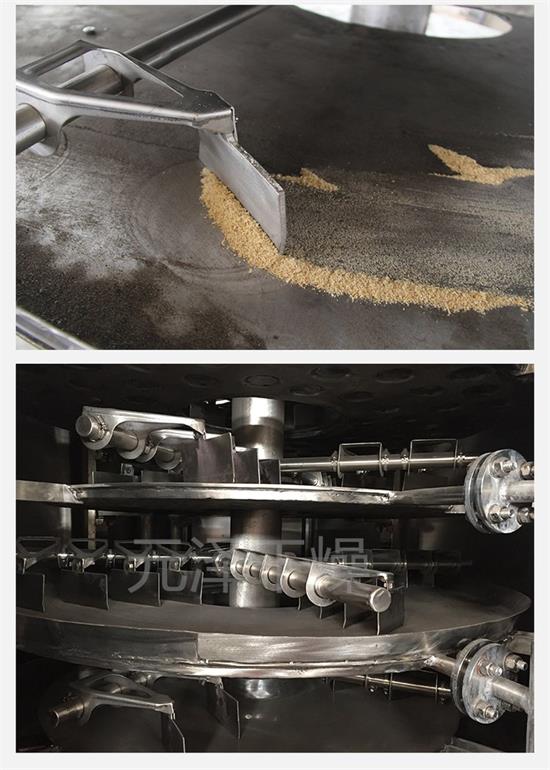 濕物料自加料器連續(xù)地加到干燥器上部層干燥盤上,帶有耙葉的耙臂作回轉(zhuǎn)運(yùn)動(dòng)使耙臂作回轉(zhuǎn)運(yùn)動(dòng)使耙葉連續(xù)地翻抄物料。物料沿指數(shù)螺旋線流過(guò)干燥盤表面,在小干燥盤上的物料被移送到外緣,并在外緣落到下方的大干燥盤外緣,在大干盤上物料向里移動(dòng)并從中間落料口落如下一層小干燥盤中。大小干燥盤上下交替排列,物料得以連續(xù)地流過(guò)整個(gè)干燥器。中空的干燥盤內(nèi)通入加熱介質(zhì),加熱介質(zhì)形式有飽和蒸汽、熱水和導(dǎo)熱油,加熱介質(zhì)由干燥盤的一端進(jìn)入,從另一端導(dǎo)出。已干物料從后一層干燥盤落到殼體的底層,后被耙葉移送到出料口排出。濕份從物料中逸出,由設(shè)在頂蓋上的排濕口排出,真空型盤式干燥器的濕氣由設(shè)在頂蓋上的真空泵口排出。從底層排出的干物料可直接包裝。通過(guò)配加翅片加熱器、溶劑回收冷凝器、袋式除塵器、干料返混機(jī)構(gòu)、引風(fēng)機(jī)等輔機(jī),可提高其干燥的生產(chǎn)能力,干燥膏糊狀和熱敏性物 料,可方便地回收溶劑,并能進(jìn)行熱解和反應(yīng)操作。