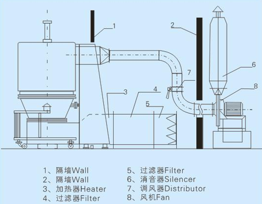 空氣經(jīng)加熱凈化后,由引風(fēng)機(jī)從下部導(dǎo)入,穿過(guò)料斗的孔洞板。在工作室內(nèi),經(jīng)攪拌和負(fù)壓作用形成流態(tài)化,水份快速蒸發(fā)后隨著排氣帶走,物料快速干燥。