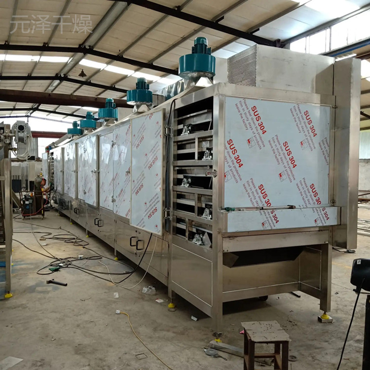 物料由加料器均勻地鋪在網(wǎng)帶上,網(wǎng)帶一般采用12-60目不銹鋼絲網(wǎng),由傳動(dòng)裝置拖動(dòng)在干燥機(jī)內(nèi)移動(dòng)。干燥機(jī)由若干單元組成,每一單元熱風(fēng)獨(dú)立循環(huán),部分尾氣由專門排濕風(fēng)機(jī)排出,廢氣由調(diào)節(jié)閥控制,熱氣由下往上或由上往下穿過鋪滿物料的網(wǎng)帶完成熱量與質(zhì)量傳遞的進(jìn)程,帶走物料水份。網(wǎng)帶緩慢移動(dòng),運(yùn)行速度可根據(jù)物料溫度自由調(diào)節(jié),干燥后的成品連續(xù)落入收料器中。上下循環(huán)單元根據(jù)用戶需要可靈活配備,單元數(shù)量亦可根據(jù)需要選取。