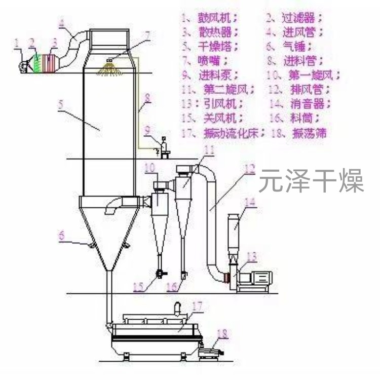 壓力噴霧干燥機(jī)工作過(guò)程為:料液通過(guò)隔膜泵高壓輸入,噴出霧狀液滴,然后同熱空氣并流下降,大部分粉粒由塔底排料口收集,廢氣及其微小粉末經(jīng)旋風(fēng)分離器分離,廢氣由抽風(fēng)機(jī)排出,粉末由設(shè)在旋風(fēng)分離器下的收粉筒收集,風(fēng)機(jī)出口處還可裝備二級(jí)除塵裝置,回收率在96%-98%。