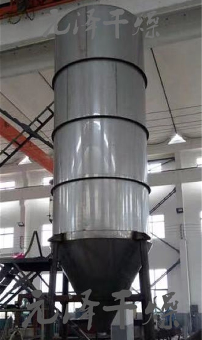 壓力式噴霧干燥機(jī)工作過程為:料液通過隔膜泵高壓輸入,噴出霧狀液滴,然后同熱空氣并流下降,大部分粉粒由塔底排料口收集,廢氣及其微小粉末經(jīng)旋風(fēng)分離器分離,廢氣由抽風(fēng)機(jī)排出,粉末由設(shè)在旋風(fēng)分離器下的收粉筒收集,風(fēng)機(jī)出口處還可裝備二級(jí)除塵裝置,回收率在96%-98%。
