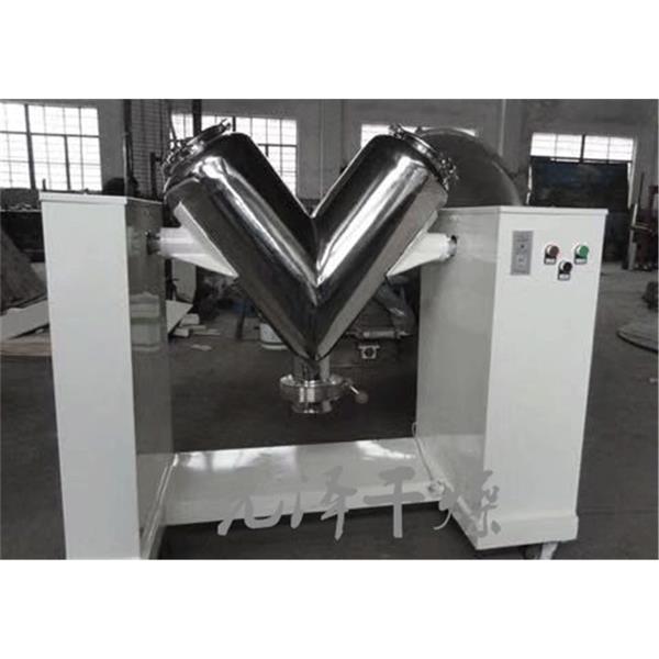 V型混合機(jī),主要由支架、混合筒、傳動(dòng)裝置、電控裝置組成?;旌贤膊捎肰型不對(duì)稱筒身,在筒身頂部裝有快開式旋蓋,便于加料。筒身底部裝有轉(zhuǎn)閥,密封性好,出料方便。加料從頂部加入后旋緊快開旋蓋手柄,由時(shí)間繼電器設(shè)定混合時(shí)間,按下起動(dòng)按鈕,混合筒沿軸線旋轉(zhuǎn),物料在V型筒體內(nèi)均勻混合,到設(shè)定時(shí)間后,電機(jī)自動(dòng)停止運(yùn)轉(zhuǎn),點(diǎn)動(dòng)起動(dòng),停止按鈕,使出料閥門轉(zhuǎn)至向下位置,打開蝶閥出料。