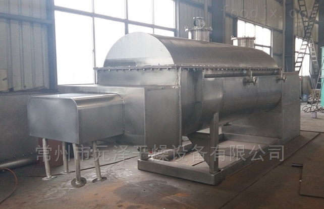 空心軸上密集排列著楔型中空漿葉,熱介質(zhì)經(jīng)空心軸流經(jīng)漿葉。單位有效容積內(nèi)傳熱面積很大,熱介質(zhì)溫度從-40℃到320℃,可以是水蒸汽,也可以是液體型:如熱水、導(dǎo)熱油等。間接傳導(dǎo)加熱,沒(méi)有攜帶空氣帶走熱量,熱量均用來(lái)加熱物料。熱量損失僅為通過(guò)器體保溫層向環(huán)境的散熱。楔型漿葉傳熱面具有自清潔功能。物料顆粒與楔型面的相對(duì)運(yùn)動(dòng)產(chǎn)生洗刷作用,能夠洗刷掉楔型面上附著物料,使運(yùn)轉(zhuǎn)中一直保持著清潔的傳熱面。漿葉干燥機(jī)的殼體為Ω型,殼體內(nèi)一般安排二到四根空心攪拌軸。殼體有密封端蓋與上蓋,防止物料粉塵外泄而充分發(fā)揮作用。