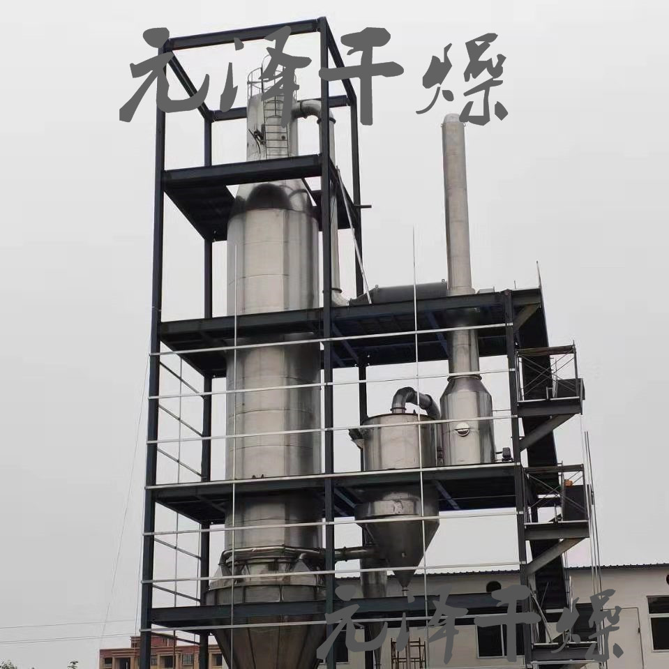 壓力噴霧干燥機(jī)工作過程為:料液通過隔膜泵高壓輸入,噴出霧狀液滴,然后同熱空氣并流下降,大部分粉粒由塔底排料口收集,廢氣及其微小粉末經(jīng)旋風(fēng)分離器分離,廢氣由抽風(fēng)機(jī)排出,粉末由設(shè)在旋風(fēng)分離器下的收粉筒收集,風(fēng)機(jī)出口處還可裝備二級(jí)除塵裝置,回收率在96%-98%。