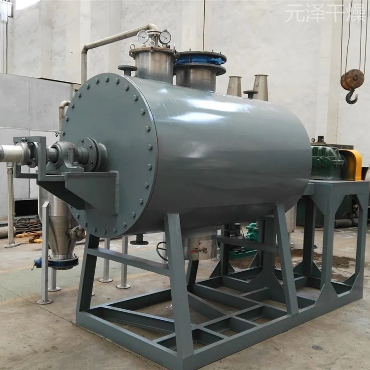 干燥物料從殼體上方正中間加入,在不斷轉(zhuǎn)動的耙齒的攪拌下,物料與殼體壁接觸時,表面不斷更新,被干燥物料受到蒸汽間接加熱,而使物料水分氣化,氣化的水分由真空泵及時抽走,該機可同時采用夾層與耙齒同時加熱方式,傳熱面積更大,熱效率高,使其獲得更高的干燥效率。由于操作真空度較高,被干燥物料表面水蒸氣壓力遠(yuǎn)大于干燥機殼體內(nèi)蒸發(fā)空間的水蒸氣壓力,從而有利于被干燥物料內(nèi)部水分和表面水分的排出,有利于被干燥物料的水分子運動,達(dá)到干燥目的。